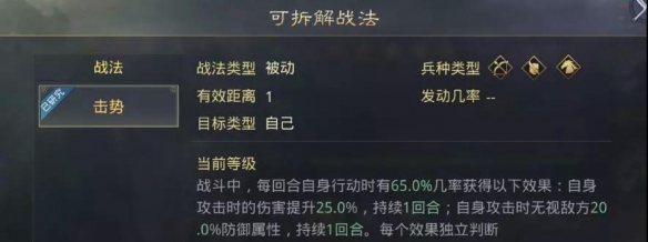 【击势】为被动战法,其效果为每回合自身行动时有65%几率获得以下效果:自身攻击时的伤害提升;自身攻击时无视敌方一定的防御属性。每个效果独立判定。