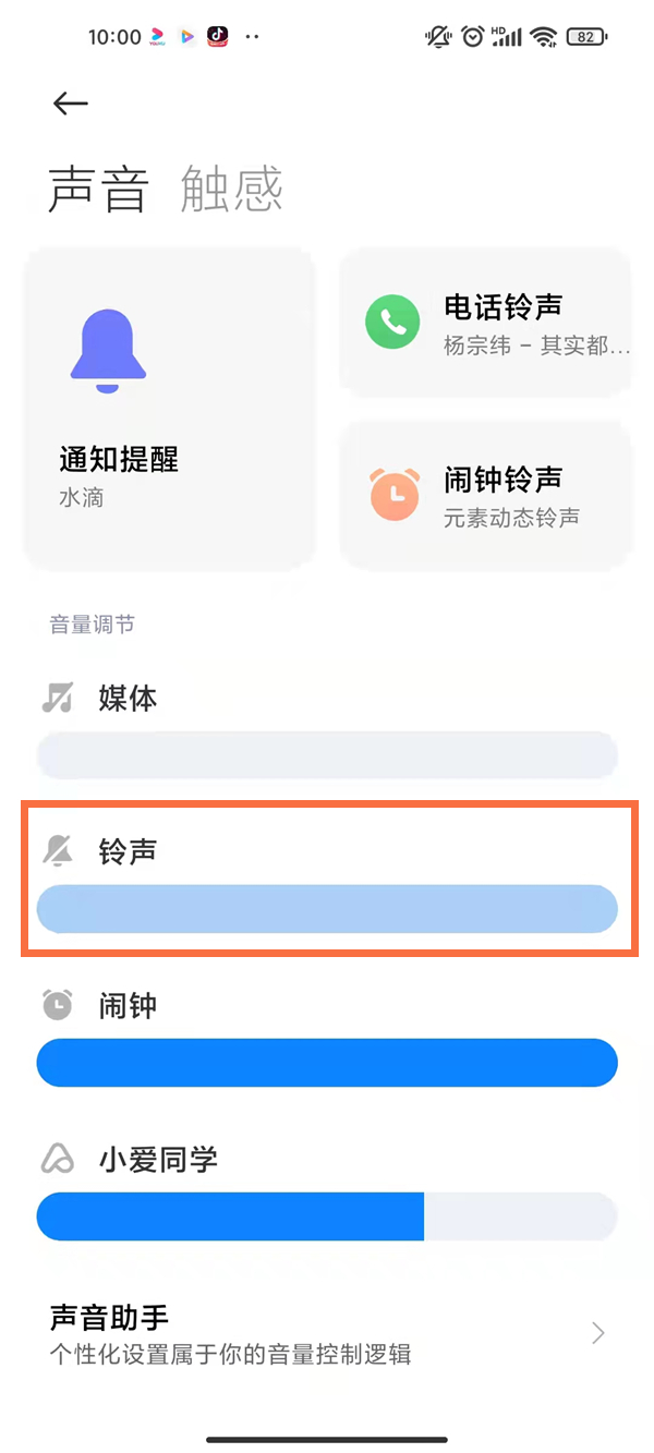 2、在声音界面找到铃声,将调节条向右滑动即可调大。