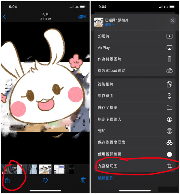 添加后,打开某个图片,点击分享图标,选择九宫格切图即可使用。