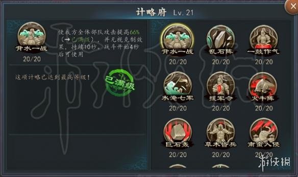 解锁计略府建筑,解锁战场中可使用计略的建筑,提升计略等级可加强计略威力;提升建筑等级可解锁更多计策供使用。